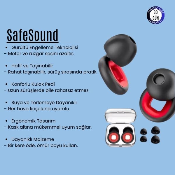 SafeSound, rüzgar ve gürültüyü azaltır, önemli sesleri kaçırmaz. Kask içinde rahat, hafif ve suya dayanıklıdır. Sürüş artık hem konforlu hem güvenli! 🏍️💨